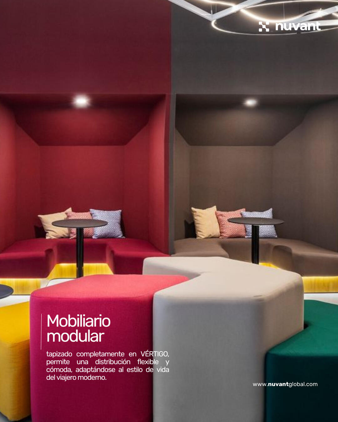 El mobiliario modular, tapizado completamente en VÉRTIGO, permite una distribución flexible y cómoda, adaptándose al estilo de vida del viajero moderno. Su composición lo hace perfecto para zonas comunes de alto uso, manteniendo su apariencia y confort por más tiempo.