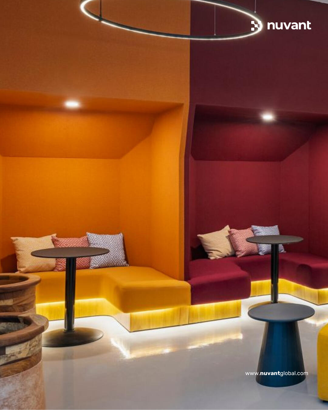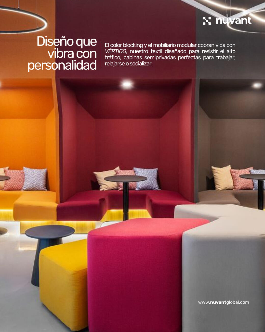 El color blocking y el mobiliario modular crean cabinas semiprivadas perfectas para trabajar, relajarse o socializar, mientras que la iluminación envolvente aporta calidez y modernidad.